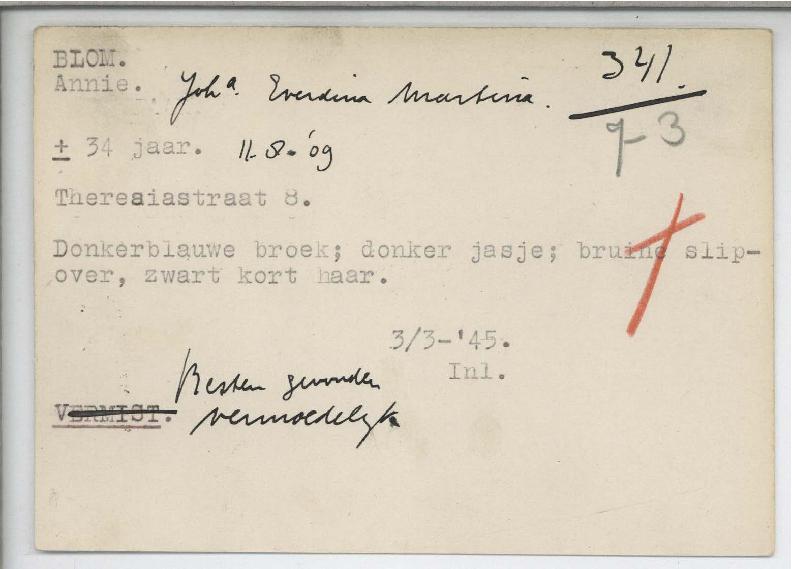 Anni is ongehuwd en dochter van Petrus Marinus Maria Johannes Blom en Frederika Smit. Ze is geindentificeerd door Antonie Wijnekes en haar vader op basis van een los zittende goude kroon. De beenderresten van Anni worden in Kistno.500 op 20 juni 1945 vrijgegeven door den Officier van Justitie.